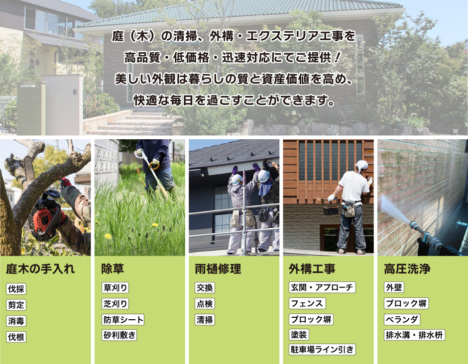 - 多少の雨であれば雨具を着て作業いたします。大変恐縮ですが、天候の状況しだいでは作業日延期のご相談をさせて頂く場合がございますので予めご了承ください。