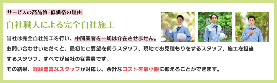 - 多少の雨であれば雨具を着て作業いたします。大変恐縮ですが、天候の状況しだいでは作業日延期のご相談をさせて頂く場合がございますので予めご了承ください。